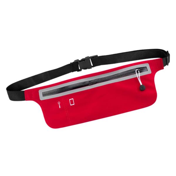 Banano impermeable, en tela Polyester Stretch 210 Waterproof. Incluye banda-cinturón elasticado ajustable color negro, bandas reflectantes color plateado, cierre-eclair impermeable y doble compartimento, uno para smart-phone, otro para accesorios como llaves o monedas.