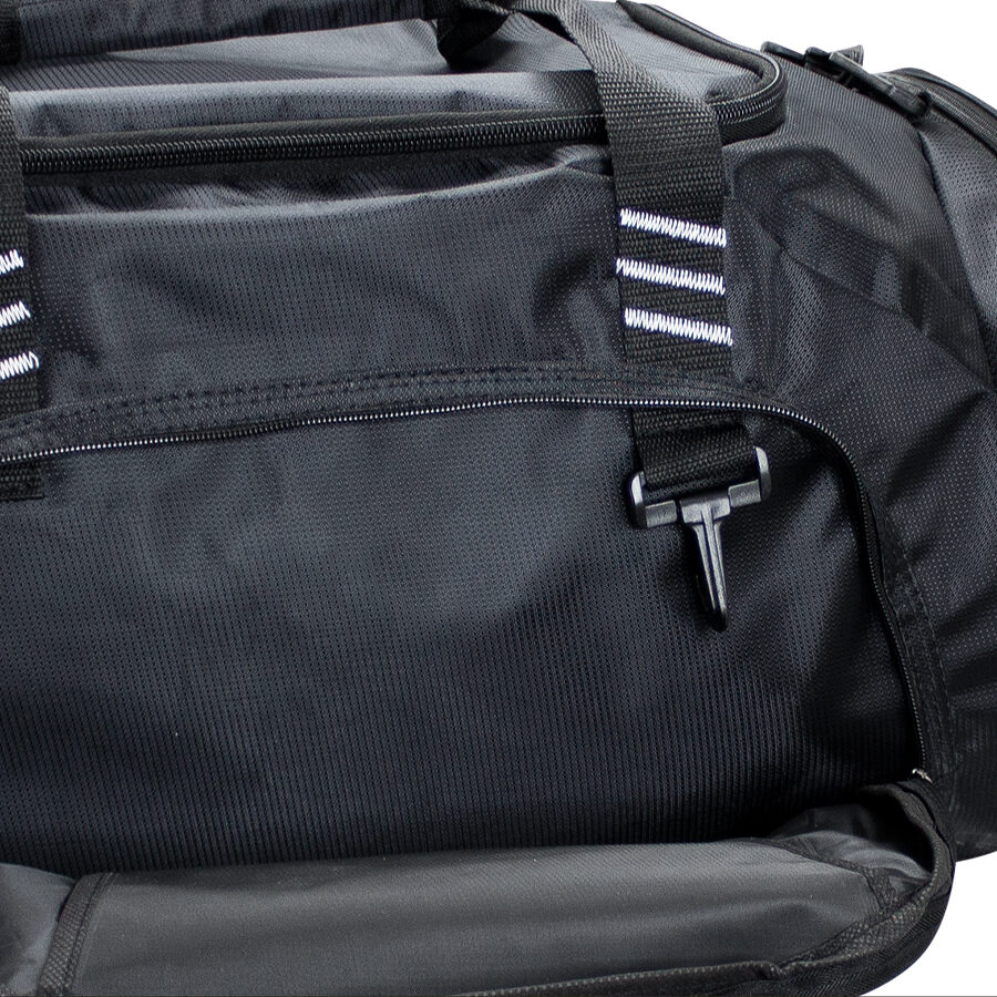 DELUXE Bolso Deportivo y de Viaje grande, modelo «TRAVEL & SPORT». Tela Polyester 840D Jacquard, impermeable. Capacidad 50 litros, tamaño 57 x 32 x 28 cm. Incluye compartimento lateral independiente para Zapatos. Compartimento principal y Bolsillo lateral con vivo y costuras reforzadas. Base protectora de Cartón Forrado. Bolsillo delantero independiente para bordar logo. Un bolso de lujo para sus viajes o paseos.