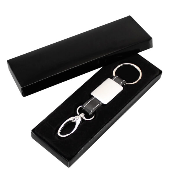 Llavero Metal Eco-cuero modelo «Technic». Presentación en estuche laminado negro con cuna aterciopelada.