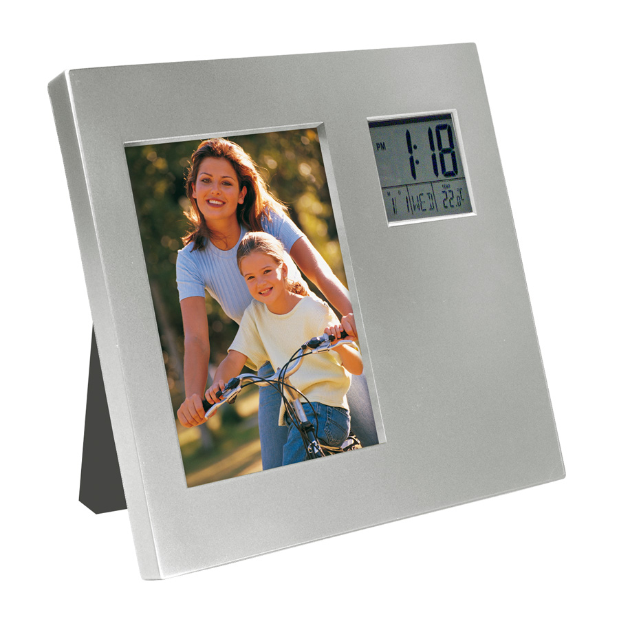 Porta-Retrato de Escritorio para foto de 13 x 9 cm con Estación Meteorológica Digital, incluye Reloj-Alarma-Calendario-Termómetro. Posición Horizontal o Vertical.